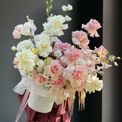 Відкрийте для себе елегантність букета «Blushing Blooms» — витончену композицію з ніжних рожевих і білих троянд французького сорту, лізіантусів та астранцій. Цей вишуканий букет випромінює ніжну красу і чарівність, що робить його ідеальним вибором для вираження щирих емоцій у будь-якій ситуації.