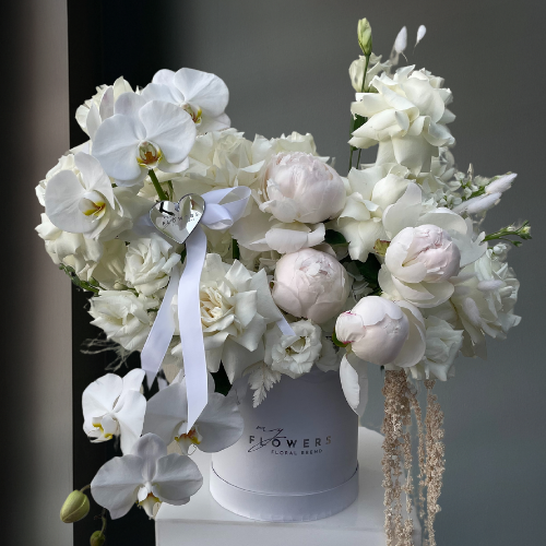 Насолоджуйтесь чудовою коробкою «Білий ранок» — чудовим поєднанням білих троянд французького стилю, хризантем, орхідей та гвоздик. Ця унікальна композиція — справжня насолода для очей, що поєднує м'які відтінки та елегантні квіти, створюючи справді незабутній подарунок.