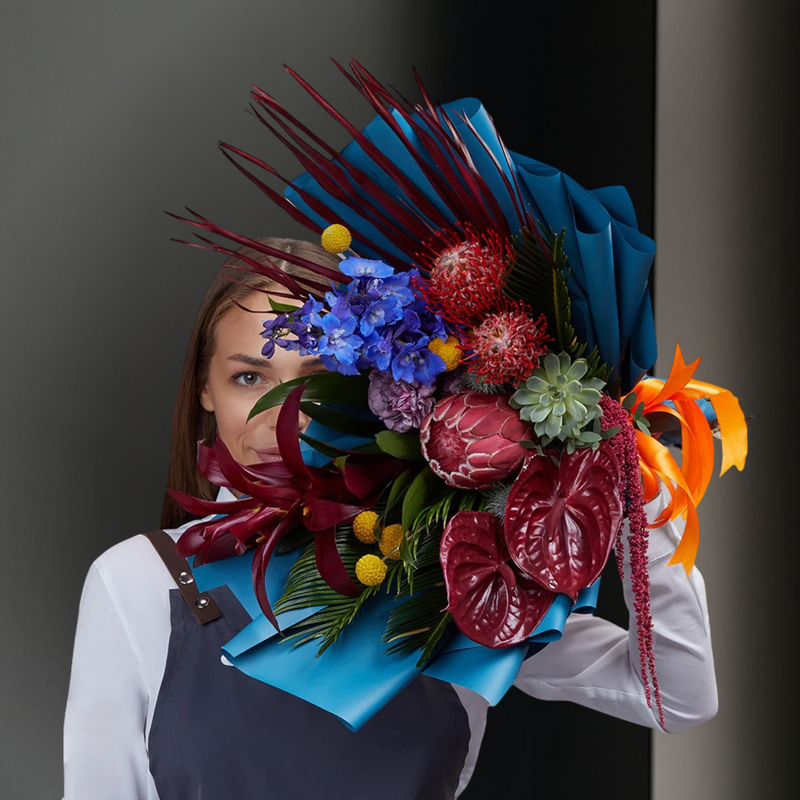 Відчуйте екзотичну красу Тропічна ніч , вражаючого букета квітів, що складається з яскравого антуріума, унікальної протеї, яскравої гузманії, вигадливої краспедії, ніжної дельфініума та елегантної ехеверії. Цей квітковий букет ідеально підійде тим, хто шукає щось незвичайне, поєднуючи тропічні елементи з сучасним дизайном для створення вражаючої композиції.