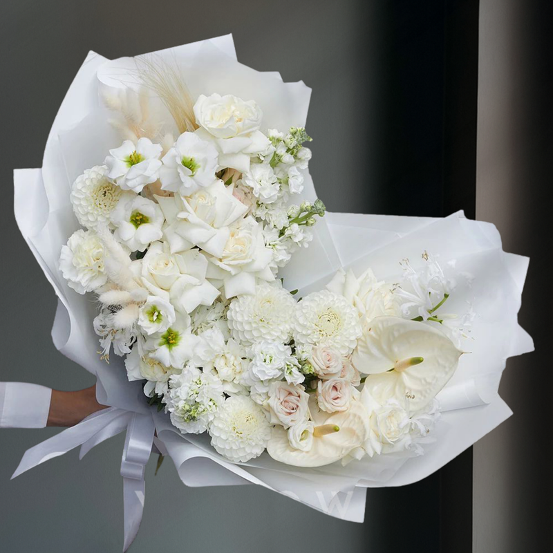 Відчуйте вишукану красу букета «Біла грація» — елегантної композиції з антуріумами, трояндами французького сорту та ніжними еустомами. Цей квітковий букет створений, щоб передати витонченість і вишуканість, тому він ідеально підійде для святкувань, щирих жестів або як центральний елемент декору, що підкреслить красу вашого приміщення.